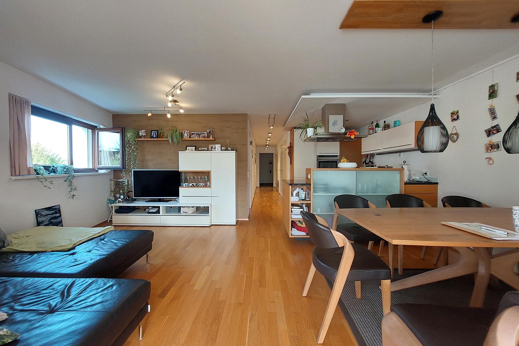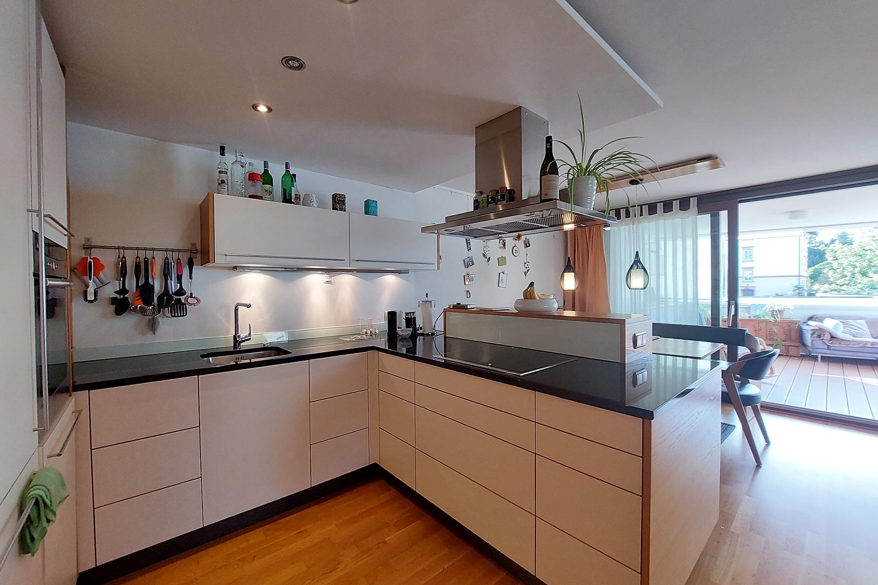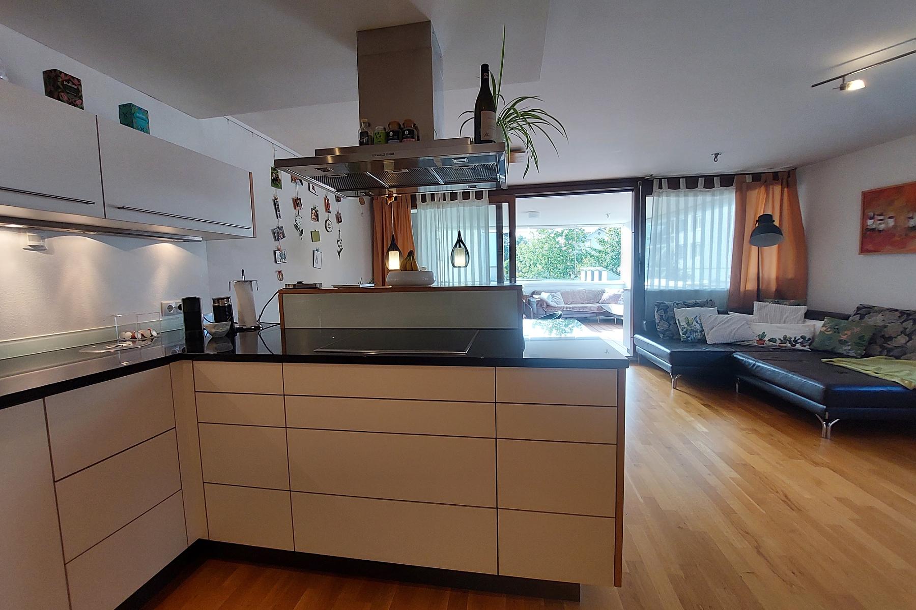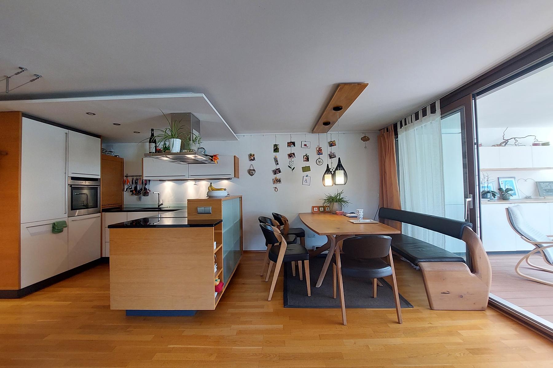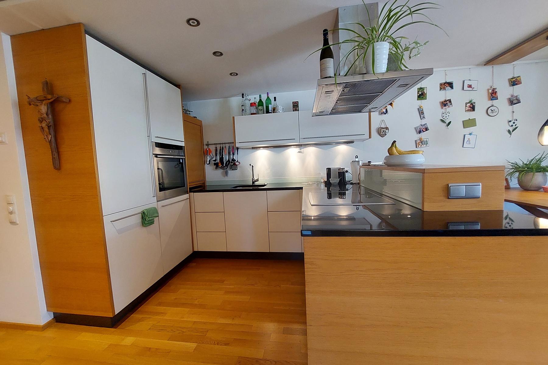 Das süd-westlich ausgerichtete Wohn-/Koch-/Esszimmer überzeugt durch die optimale Raumaufteilung, die mit einer modern und hochwertig ausgestatteten Einbauküche versehen wurde. Die Wohnwand wurde mit einem ökologischen Lehmputz versehen und vermittelt eine tolle Wohnatmosphäre.
