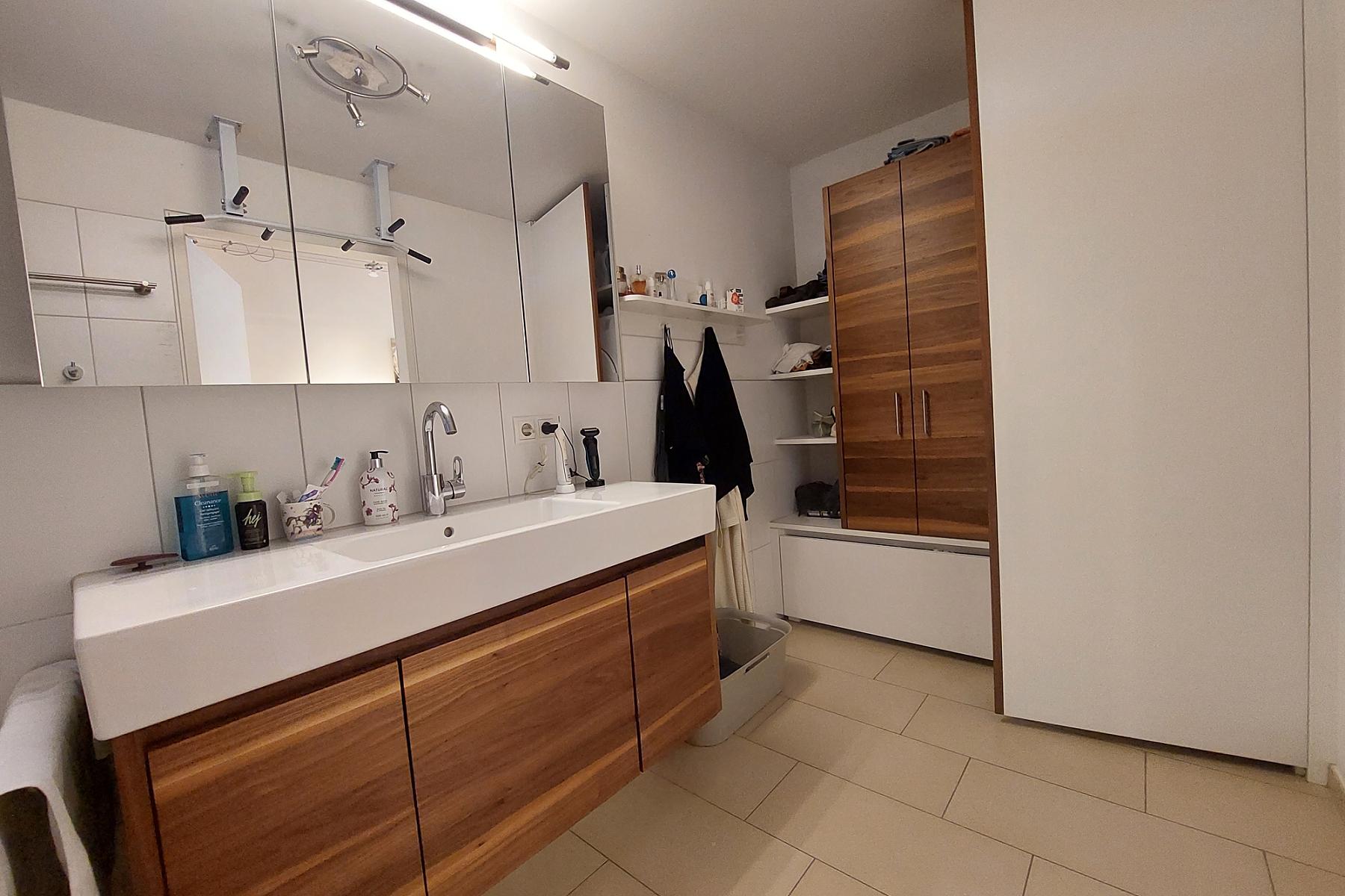 Linkerhand befindet sich das Badezimmer, dessen hochwertige Ausstattung mit einem maßgefertigtem Badverbau, Duschbadewanne und einem Spiegelschrank ausgestattet ist. Ein Waschmaschinenanschluss rundet die Gesamtausstattung ab.