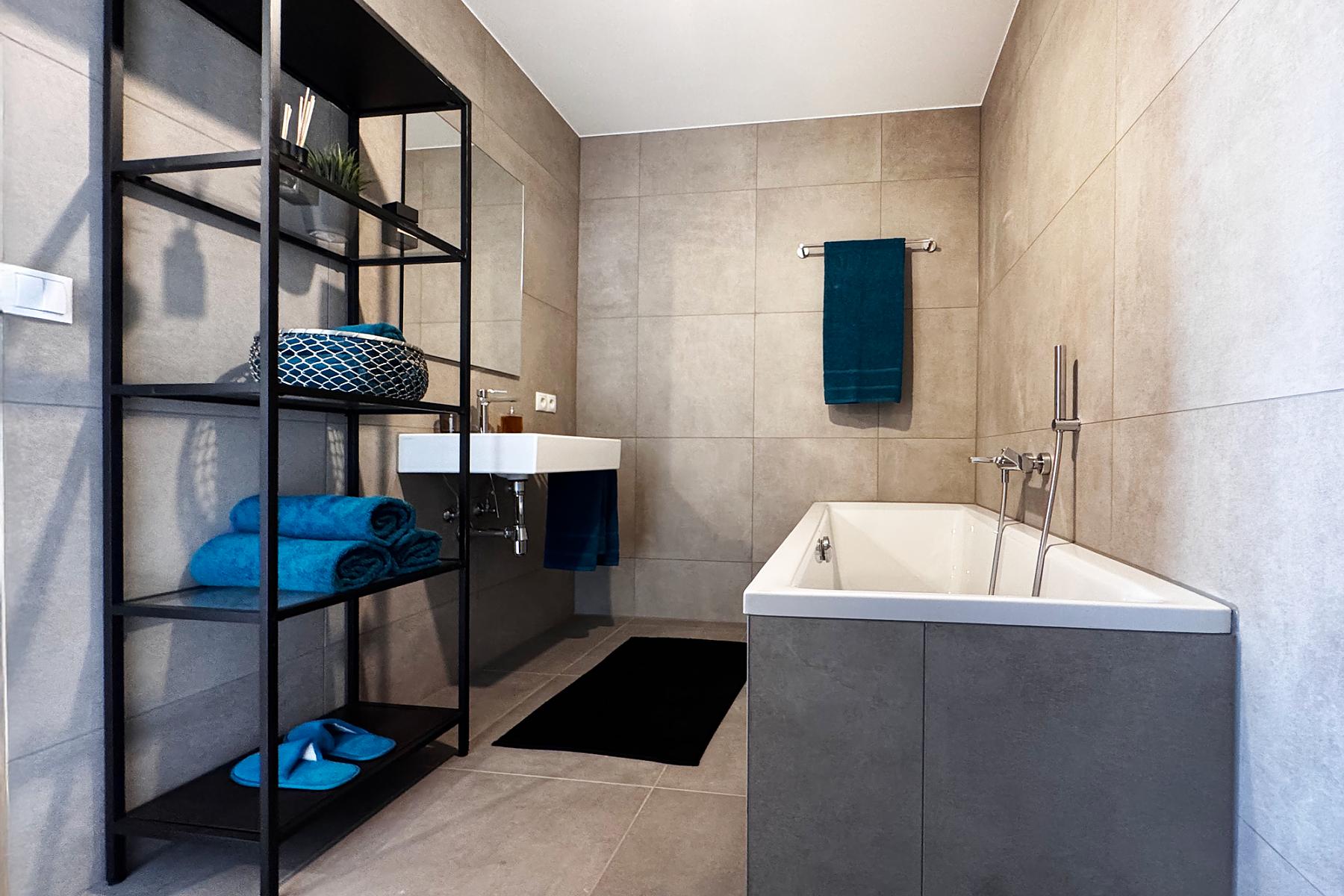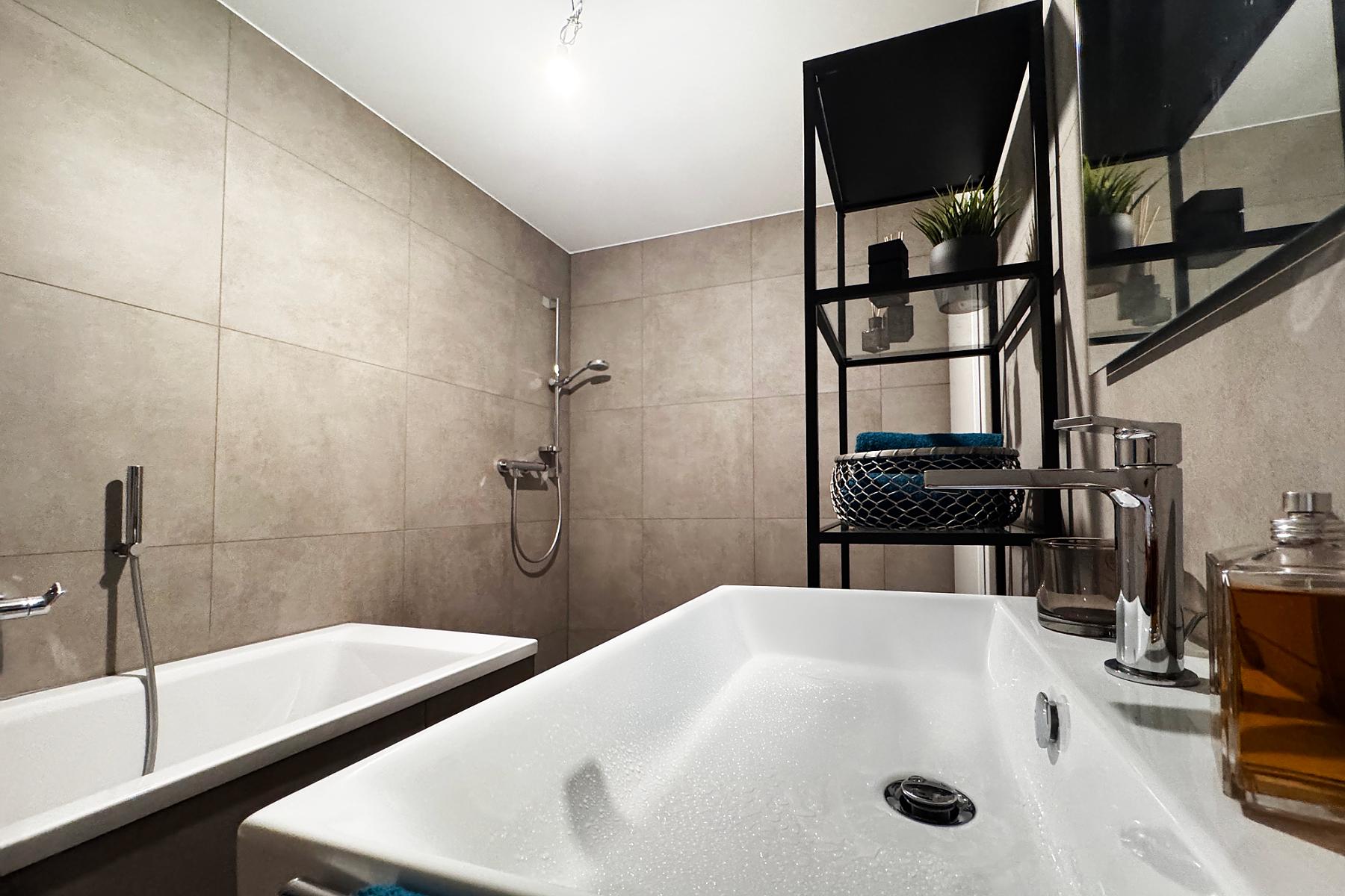 Ein WC sowie ein Abstellraum inkl. Waschmaschinenanschluss befinden sich entlang der Diele. Anschließend folgt das Badezimmer mit 5,98 m², welches über einer Dusche, einer Badewanne sowie einem Waschtisch ausgestattet wurde.