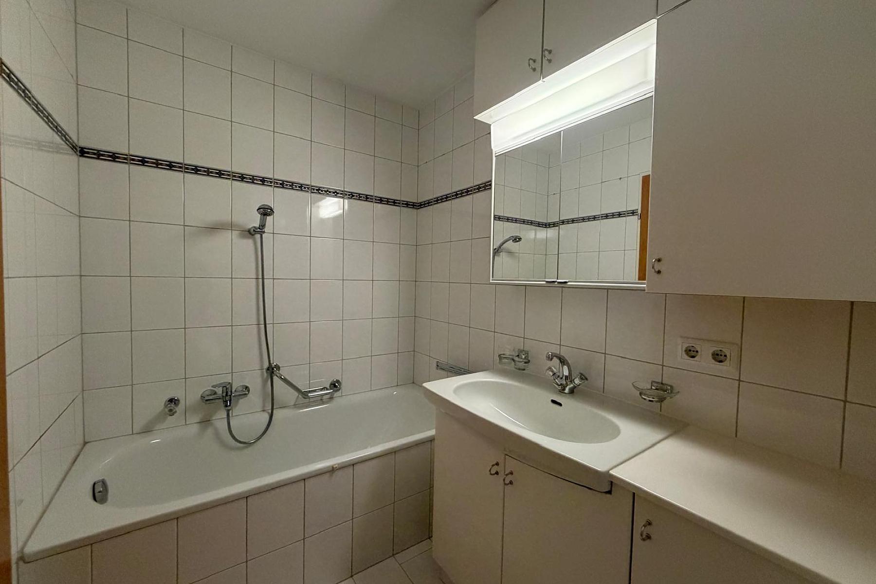 Rechterhand ersichtlich ist das Tageslichtbadezimmer mit einer Badewanne, einem Waschtisch und einem WC.