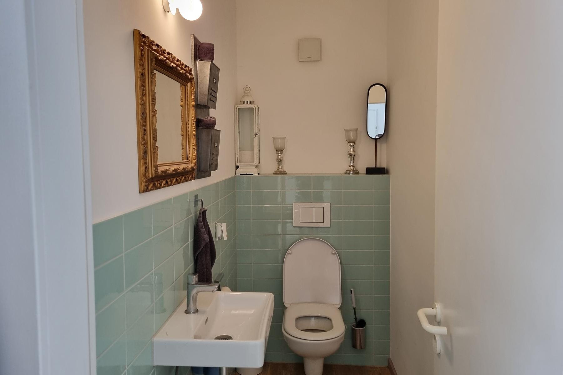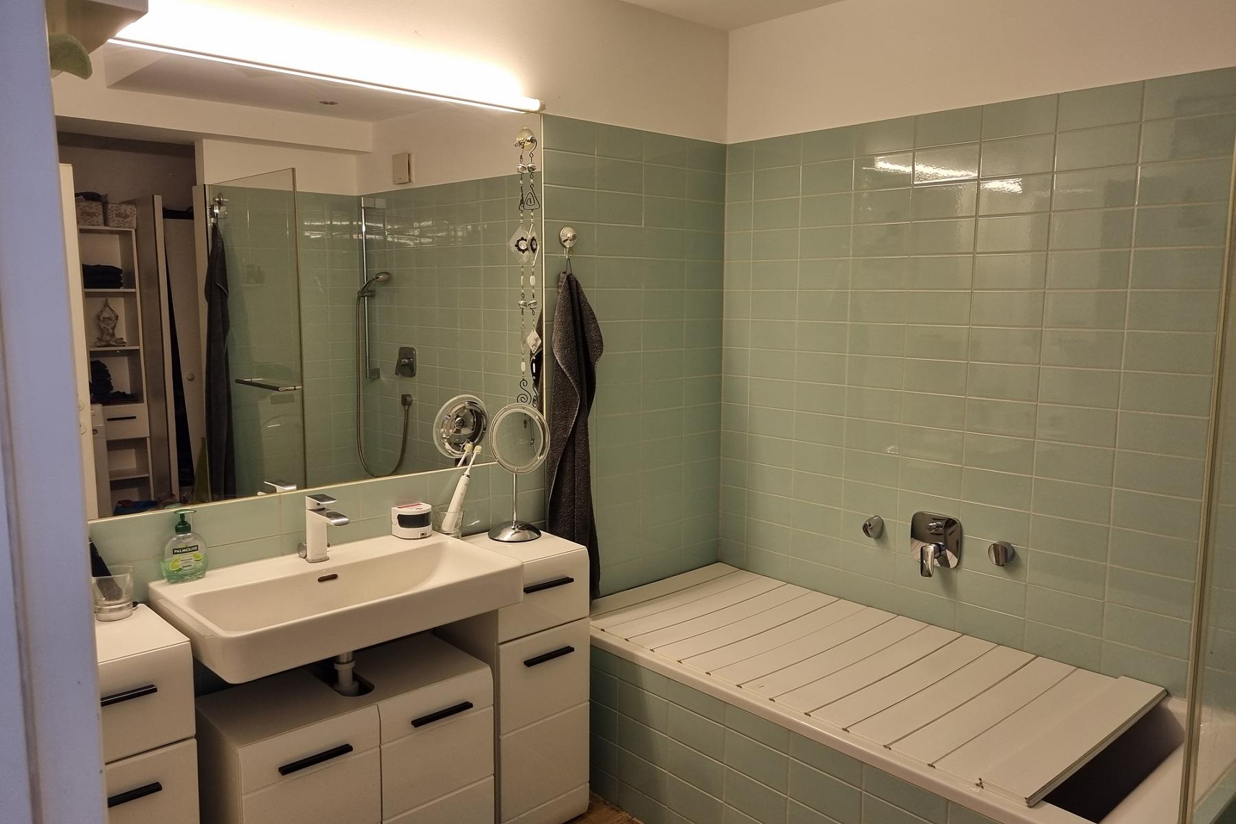 Das Badezimmer bietet eine Badewanne, eine Dusche, einen Waschtisch sowie einen Waschmaschinenanschluss. Das separate WC ist direkt nebenan.