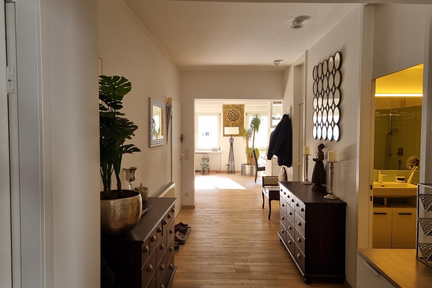 Beim Betreten der Wohnung gelangt man in einen großzügigen Gang, der ausreichend Platz für eine Garderobe und Stauraum bietet. Von hier aus sind alle Räume zentral begehbar.