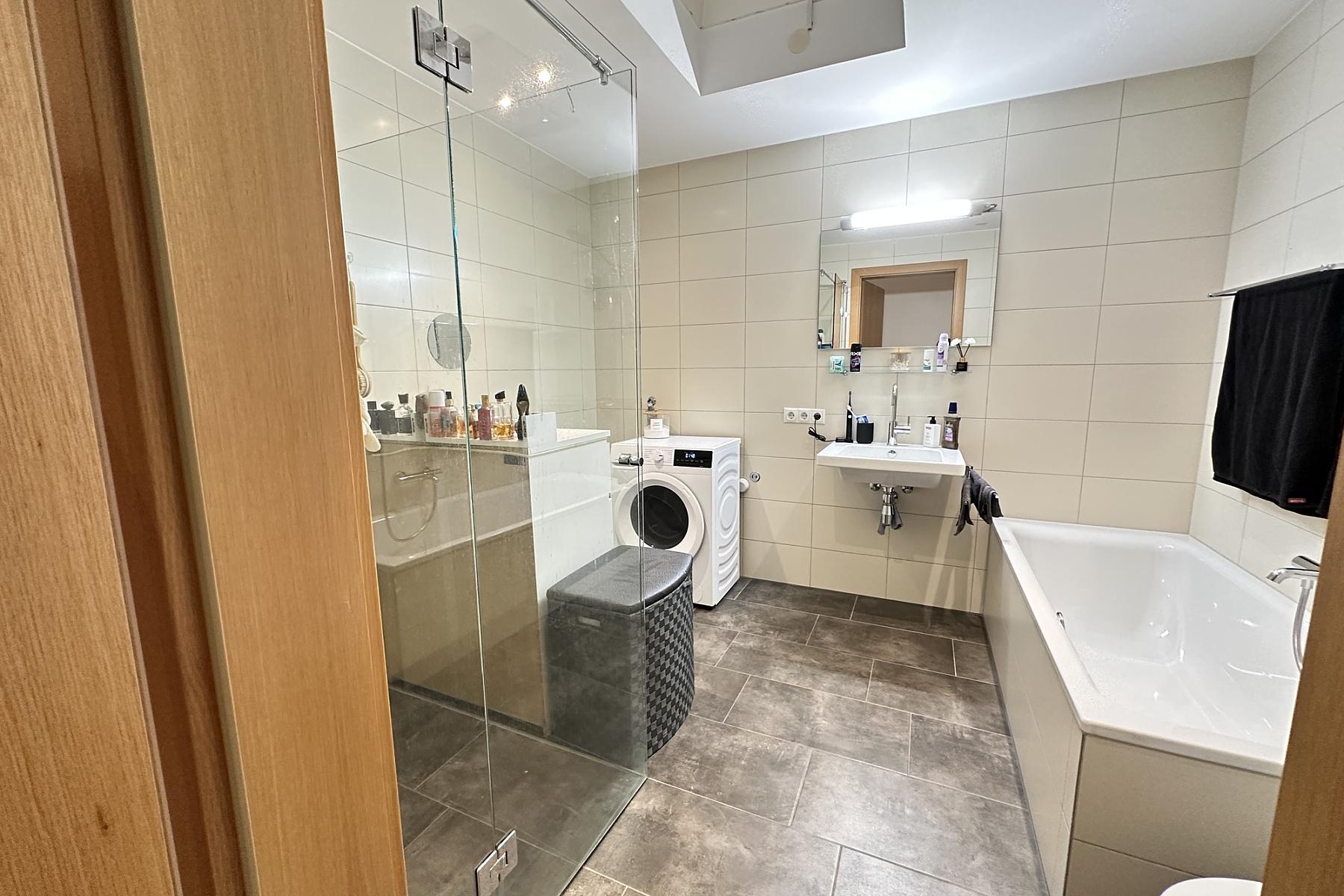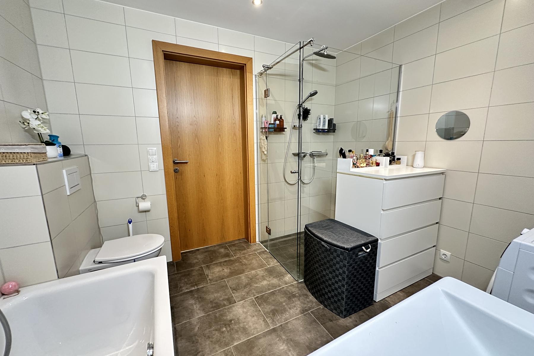 Das Tageslichtbadezimmer verfügt über eine barrierefreie Dusche, eine Badewanne, einen Waschtisch sowie ein WC.