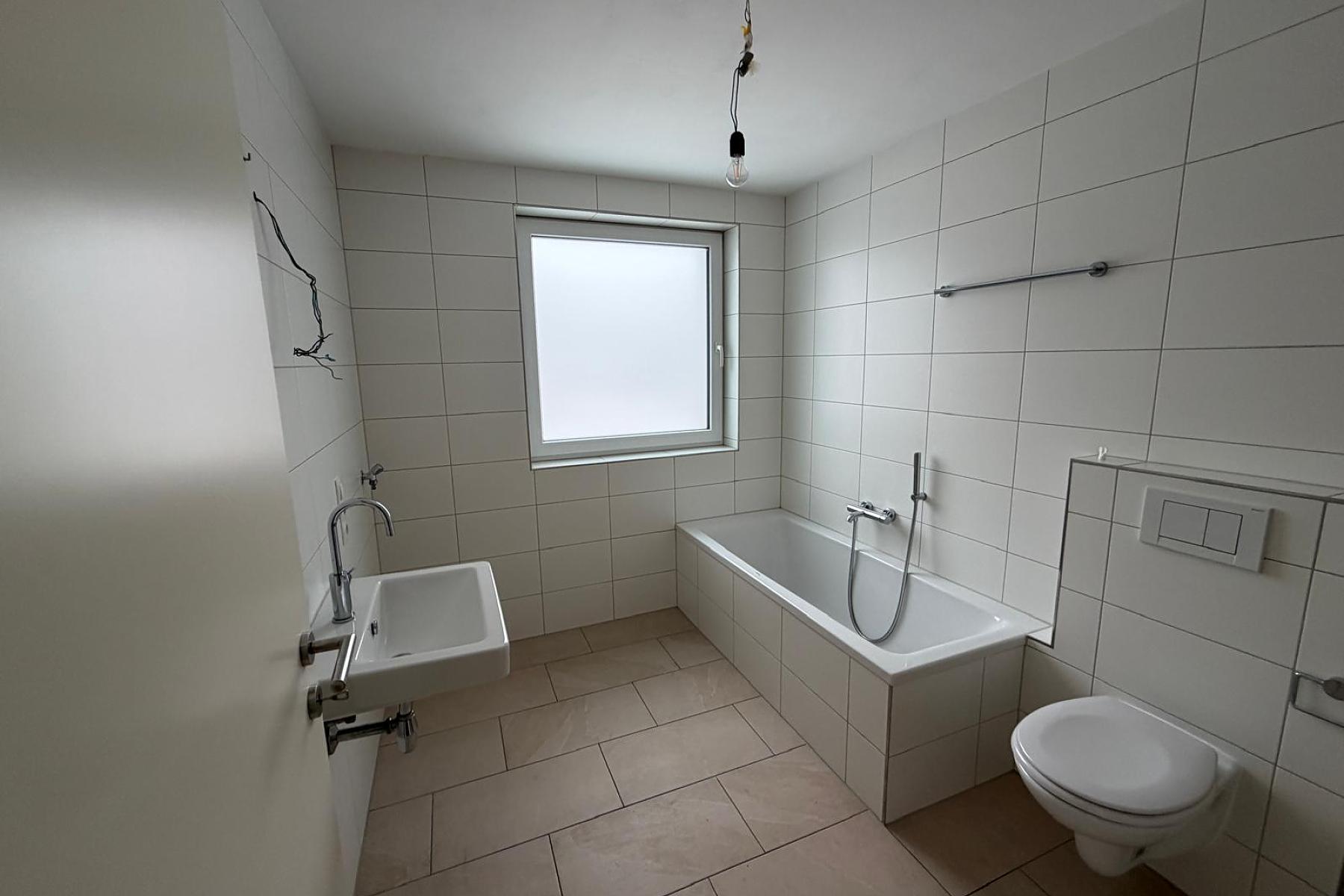 Ebenso links, grenzt das moderne Badezimmer mit einer barrierefreien Dusche, einer Badewanne, einem Waschtisch sowie ein WC.