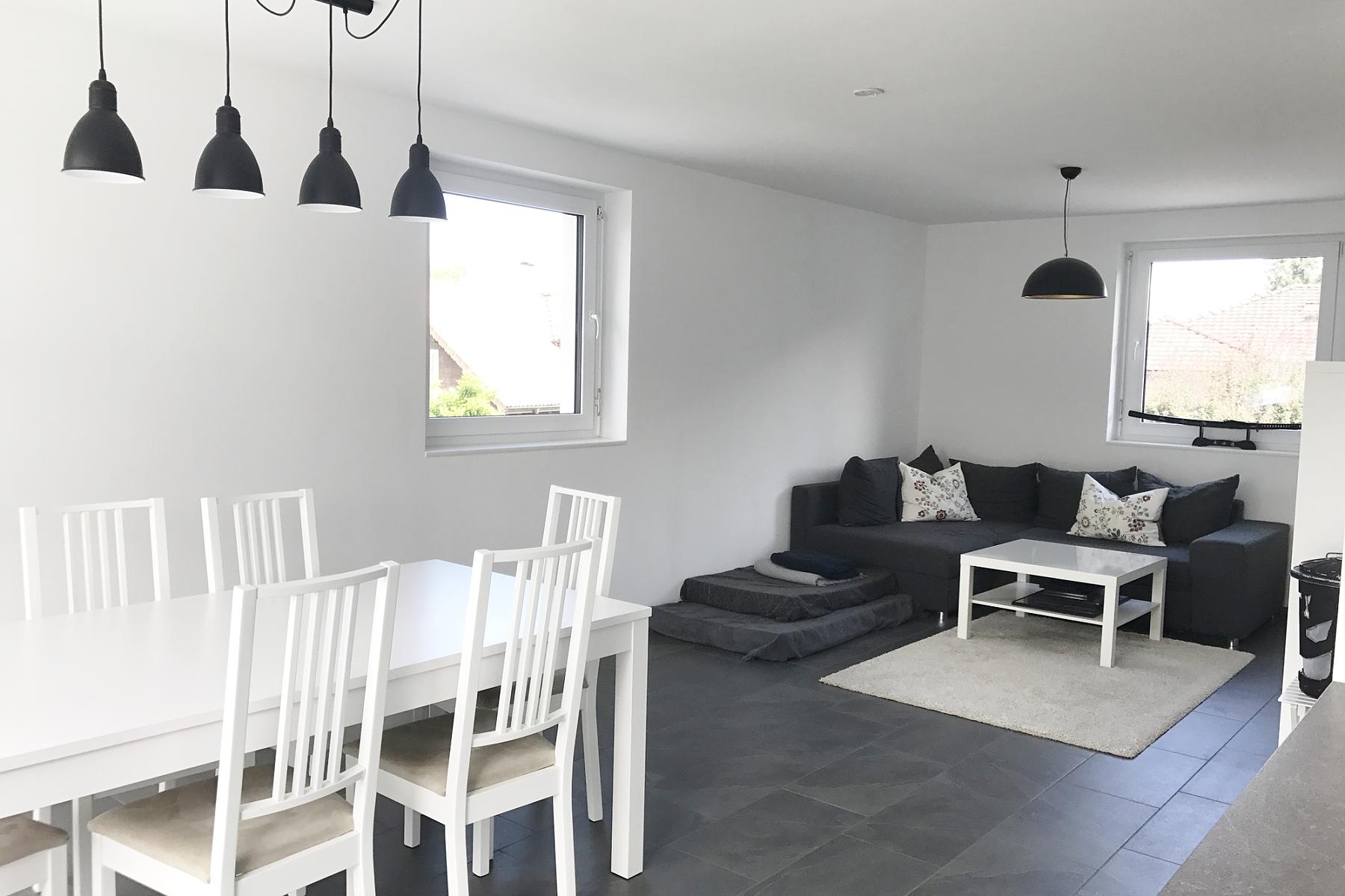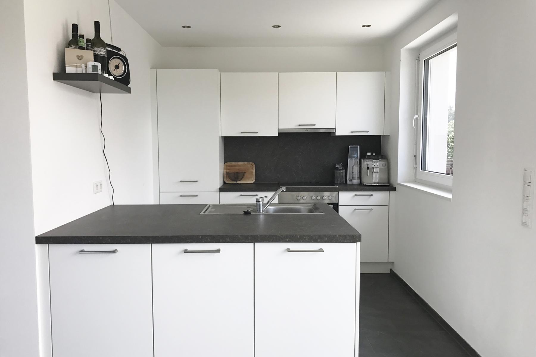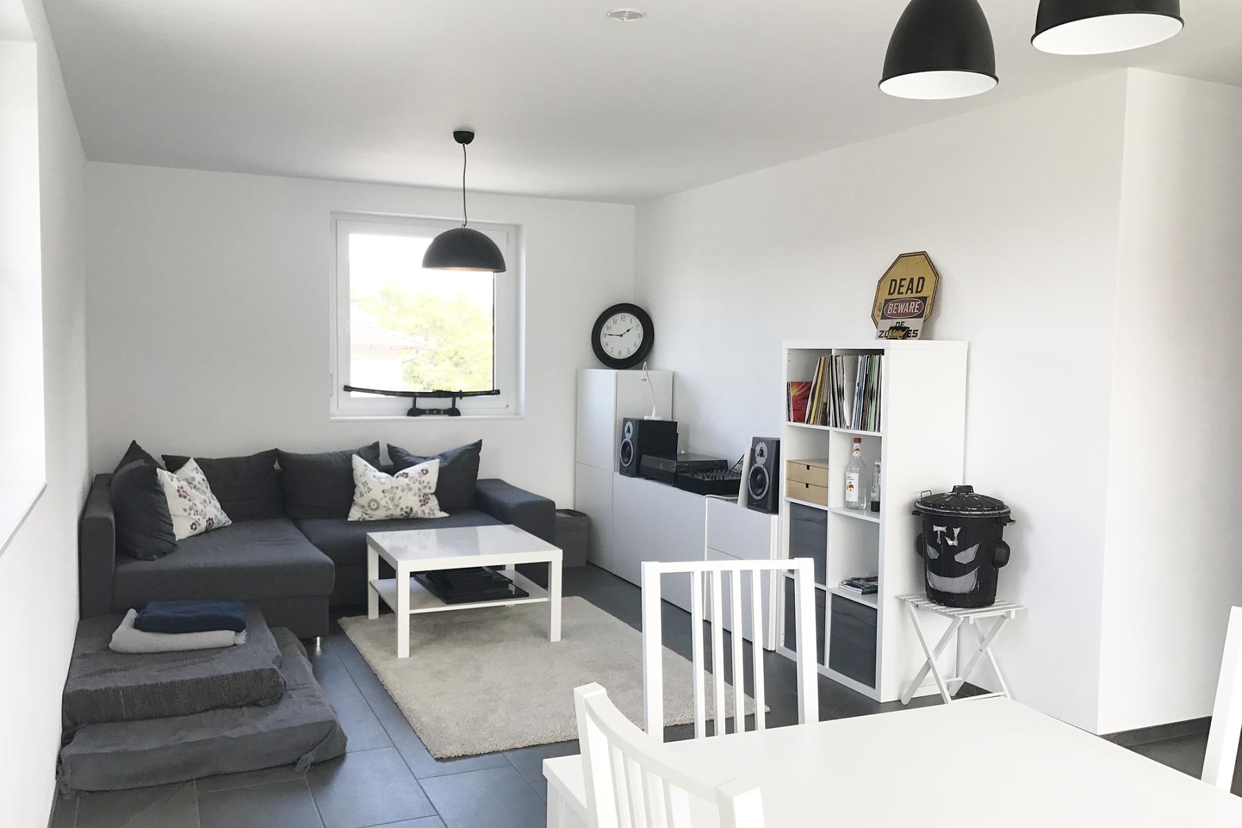 Mittelpunkt der Wohnung ist der Wohn-/Koch-/Essbereich, der mit einer Einbauküche versehen wurde. Platz für eine große Couch sowie einem Esstisch sind ebenfalls vorhanden.